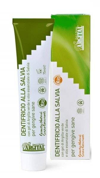Argital Pasta do zębów naturalna z szałwią na zdrowe dziąsła 75 ml, dzięki swojej unikalnej hipoalergicznej formule zapobiega chorobom dziąseł. Poleca się stosować ją w profilaktyce paradontozy. Ekstrakt z szałwii łagodzi stany zapalne i zapobiega powstawaniu aft w całej jamie ustnej.