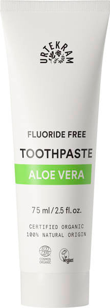 Ekologiczna pasta do zębów, skomponowana z naturalnych w 100 procentach składników, delikatnie myje i pielęgnuje nawet wrażliwe zęby. Łagodzi podrażnienia i stany zapalne dziąseł. Nie zawiera fluoru, ani żadnych chemicznych, sztucznych dodatków. Kompozycja naturalnych składników i roślinnych ekstraktów sprawia, że pasta aloesowa jest równie skuteczna w walce z próchnicą, jak i inne klasyczne pasty do zębów. Podczas mycia zębów, pasta Urtekram zapewnia komfort użycia dzięki temu, że jest łagodna, nie szczypie podczas mycia zębów, nie ma ostrego intensywnego smaku, jak większość klasycznych past, lecz pozostawia łagodny, odświeżający oddech posmak i zapach. Pasta nie pieni się za bardzo, gdyż nie zawiera szkodliwych dla zdrowia SLS – ów.