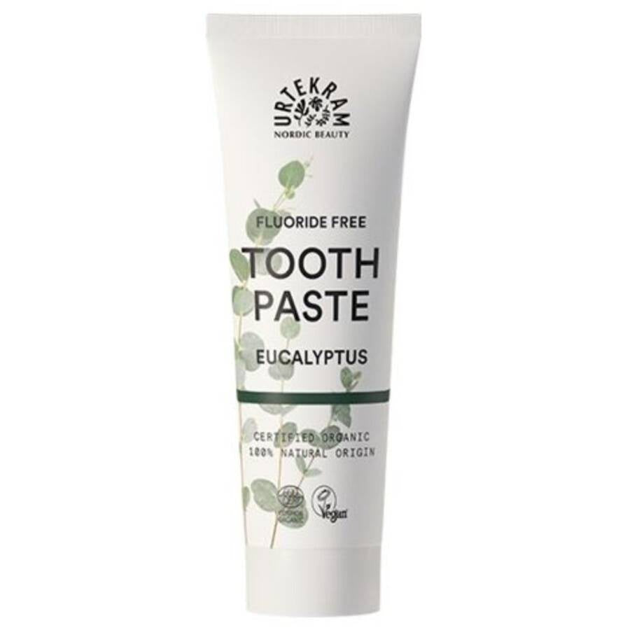 Ekologiczna pasta do zębów Urtekram z eukaliptusem nie zawiera fluoru ani żadnych chemicznych, szkodliwych substancji. Została sporządzona jedynie z naturalnych roślinnych składników z czystych ekologicznie upraw. Nie zawiera składników pochodzenia zwierzęcego, nie testowano jej też na zwierzętach. Pomimo, iż nie ma w niej fluoru, pasta doskonale chroni przed próchnicą. Unikalna formuła sprawia, że pasta działa antybakteryjnie, dba o zęby i dziąsła, a także pomaga w utrzymaniu świeżego oddechu na dłużej. Smak pasty jest przyjemny i łagodny, podczas mycia nie odczuwa się również charakterystycznego dla klasycznych past pieczenia i ostrego smaku. Pasta dba o płytkę nazębną, skutecznie usuwając kamień i osad nazębny.