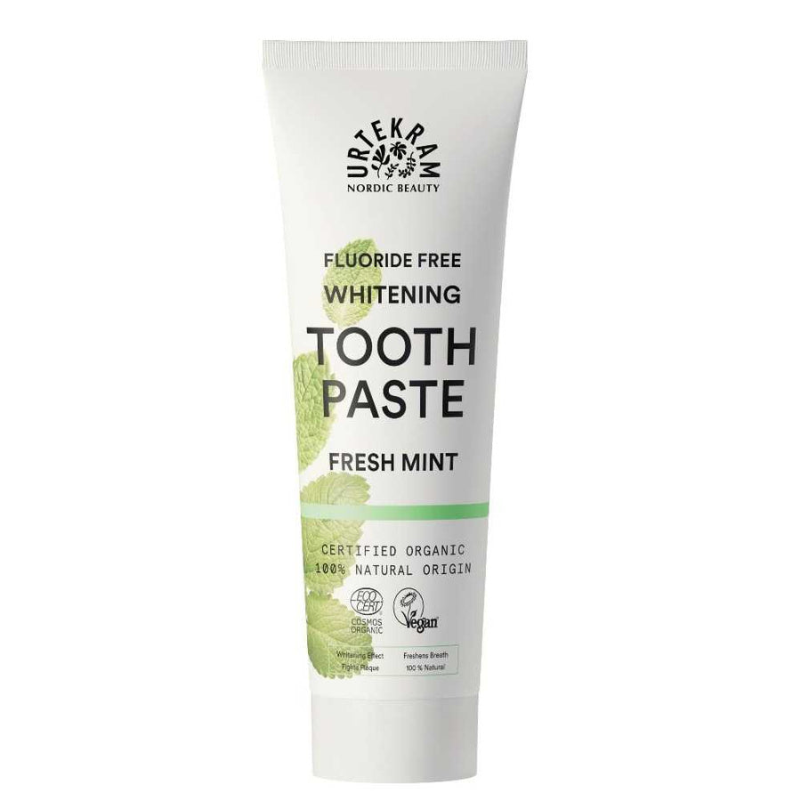 Jeśli poszukujesz naturalnych, organicznych i ekologicznych produktów do codziennej pielęgnacji, Urtekram Wybielająca pasta do zębów świeża mięta to idealny wybór. Dzięki składnikom pochodzenia naturalnego pasta nie tylko działa łagodnie i efektywnie, ale również dba o zdrowie dziąseł. Sprawdź jej działanie już dzisiaj i ciesz się zdrowym uśmiechem każdego dnia.Sposób użyciaUrtekram Wybielająca pasta do zębów świeża mięta to naturalny, organiczny i ekologiczny produkt. Można jej używać codziennie do mycia zębów. Pasta ma przyjemny smak mięty i zapewnia uczucie świeżości. Aby użyć, należy nałożyć niewielką ilość pasty na szczoteczkę i delikatnie czyścić zęby przez około 2 minuty. Nie zawiera fluoru ani sztucznych substancji wybielających.Skład INCICalcium Carbonate, Aqua, Glycerin**, Xylitol, Aloe Barbadensis Leaf Extract*, Hydrated Silica, Commiphora Myrrha Gum Oil, Mentha Arvensis Oil*, Mentha Piperita Oil*, Mentha Viridis Leaf Oil*, Menthol*, Magnolia Officinalis Bark Extract, Xanthan Gum, Hydroxyapatite, Zinc Citrate, Aroma.* składniki pochodzące z upraw ekologicznych** wyprodukowano z użyciem z surowców z upraw ekologicznych100 % wszystkich składników jest pochodzenia naturalnego20 % wszystkich składników pochodzi z upraw ekologicznych60 % składników organicznych (z wyłączeniem wody i minerałów) pochodzi z upraw ekologicznych